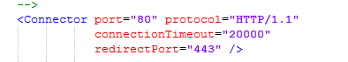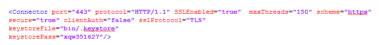 <Connector port="443" protocol="HTTP/1.1" SSLEnabled="true" maxThreads="150" scheme="https" secure="true" clientAuth="false" sslProtocol="TLS" keystoreFile="bin/.keystore" keystorePass="xqw351627"/>