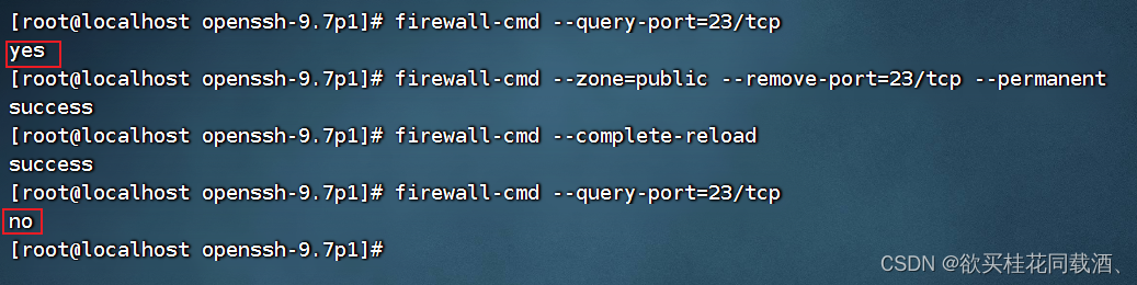 再次查看防火墙23端口是否开放 firewall-cmd --query-port=23/tcp