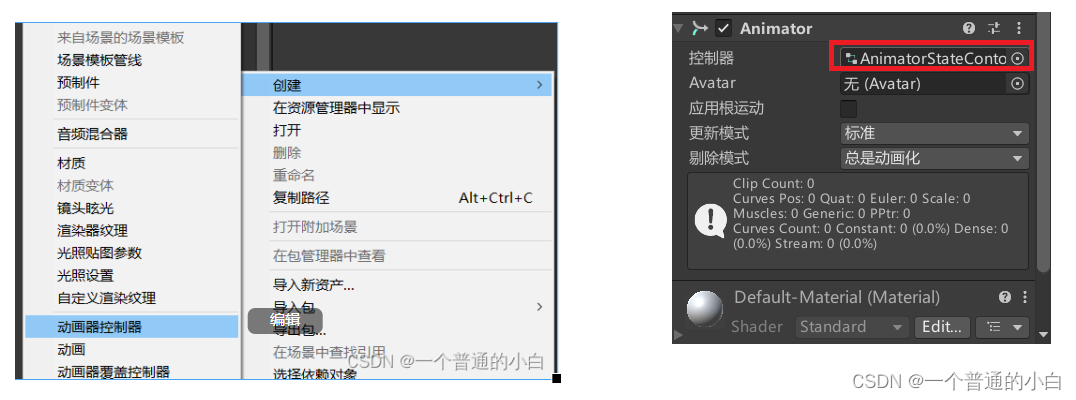 将创建的动画控制器拖拽至Animator组件的控制器
