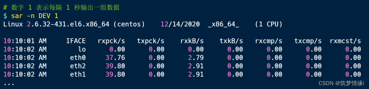 可以使⽤ sar 命令当前⽹络的吞吐率和 PPS,⽤法是给 sar 增加 -n 参数就可以查看⽹络的统计信