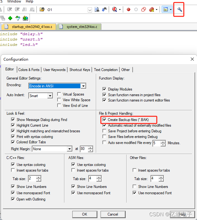 1)、在Configuration窗口中,在Editor栏中,可以在File&Project Handing中勾选上“Create Backup files(*.BAK)”选项(如图4-1),则在源文件保存后,就会对于上一版的源文件进行自动备份。然后,在工程目录下就可以找到所有源文件的备份文件(如图4-2)。