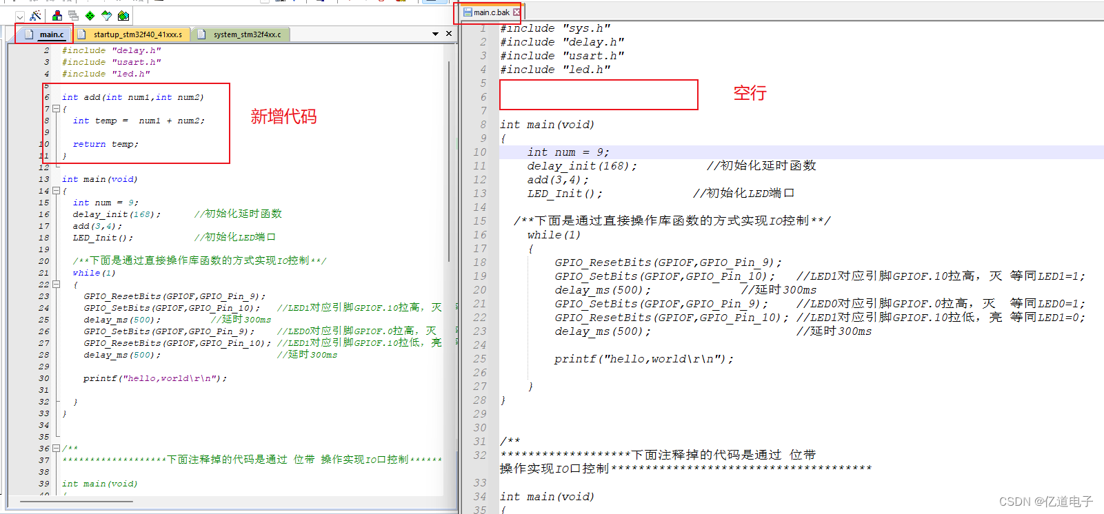 2)、例如,在main文件中添加一个add函数后保存。备份文件就会自动备份没有add函数之前的源文件(如图4-3)。