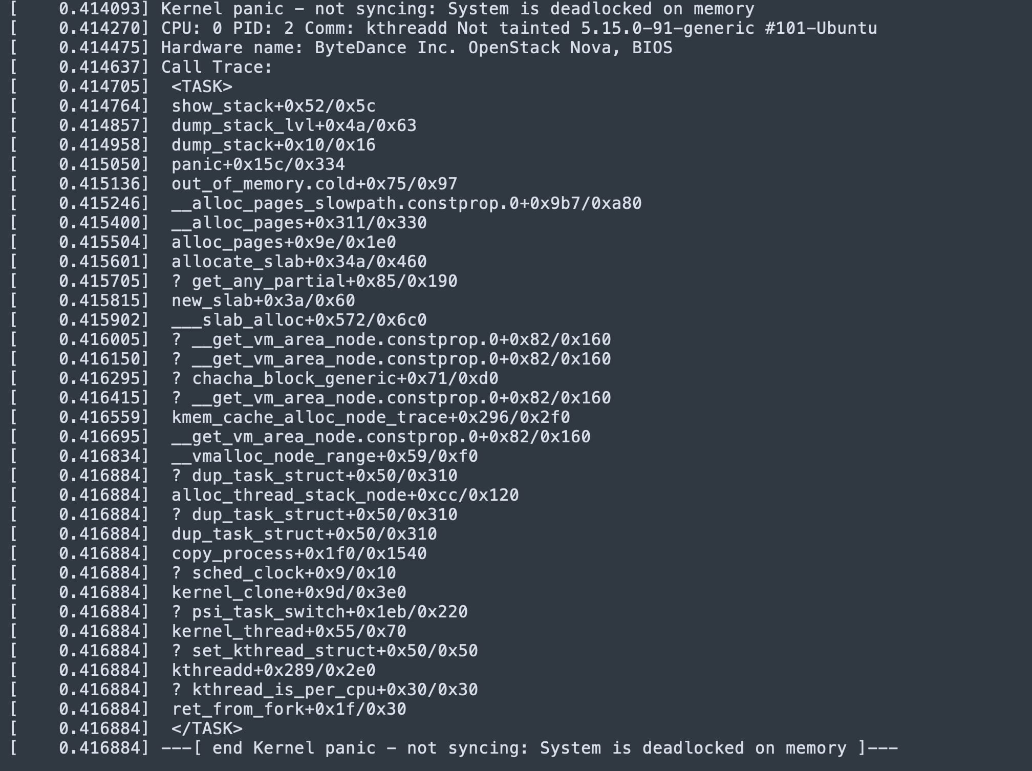 这段堆栈信息清楚地显示,系统触发了一个内核 bug,导致了严重的内核恐慌。正常情况下,当发生内核 panic 时,系统应该会崩溃并进入 kdump 流程,将 Vmcore 写入磁盘,然后重新启动。但是,我们的系统却陷入了持续的 hang 状态,这显然不太对劲。