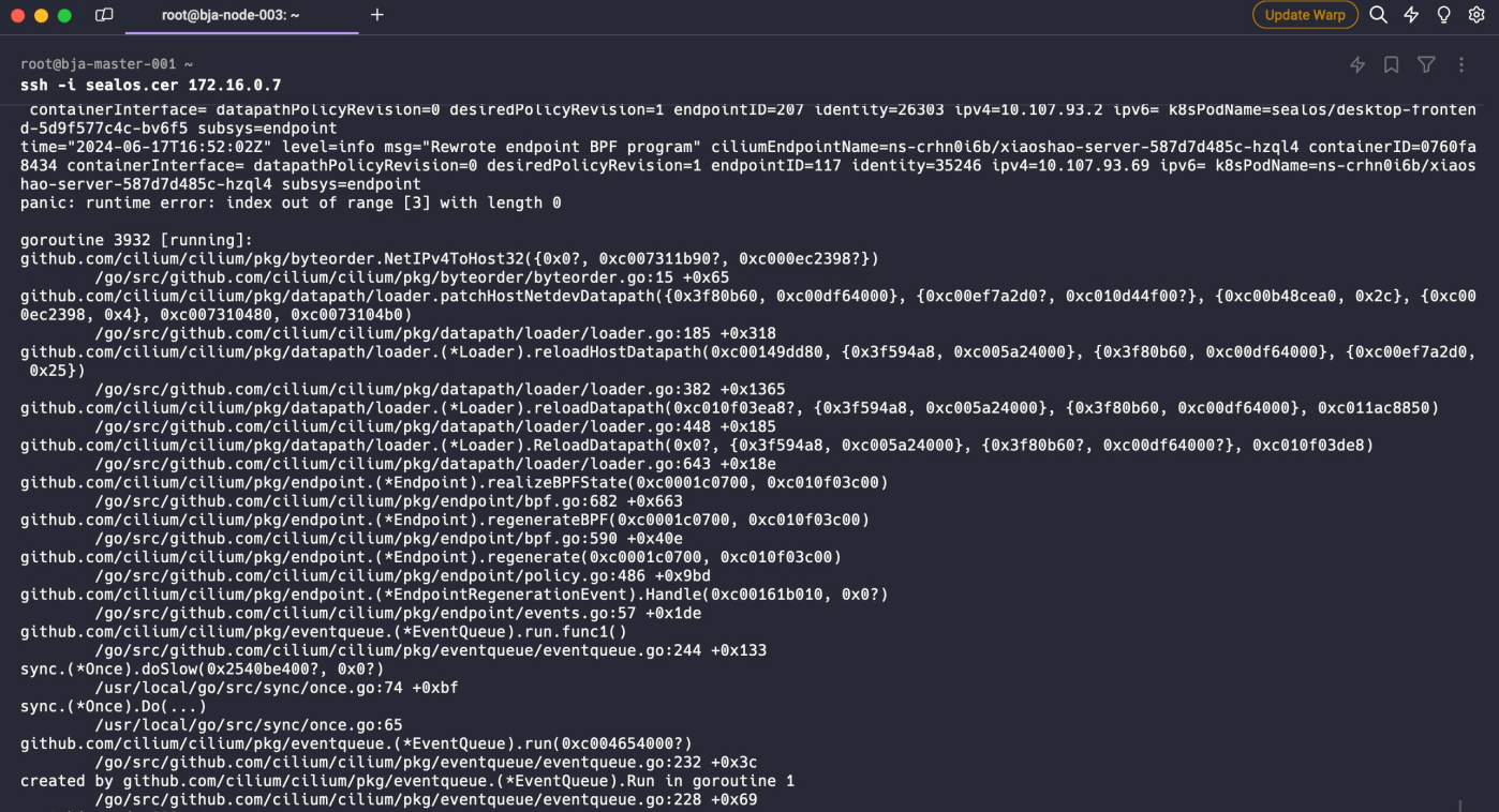 然而,事情并没有像我们预想的那样一帆风顺。在升级内核后的恢复过程中,我们又遇到了一个新的挑战——Cilium (我们使用的网络方案) 开始频繁重启,并报出了这样的错误: