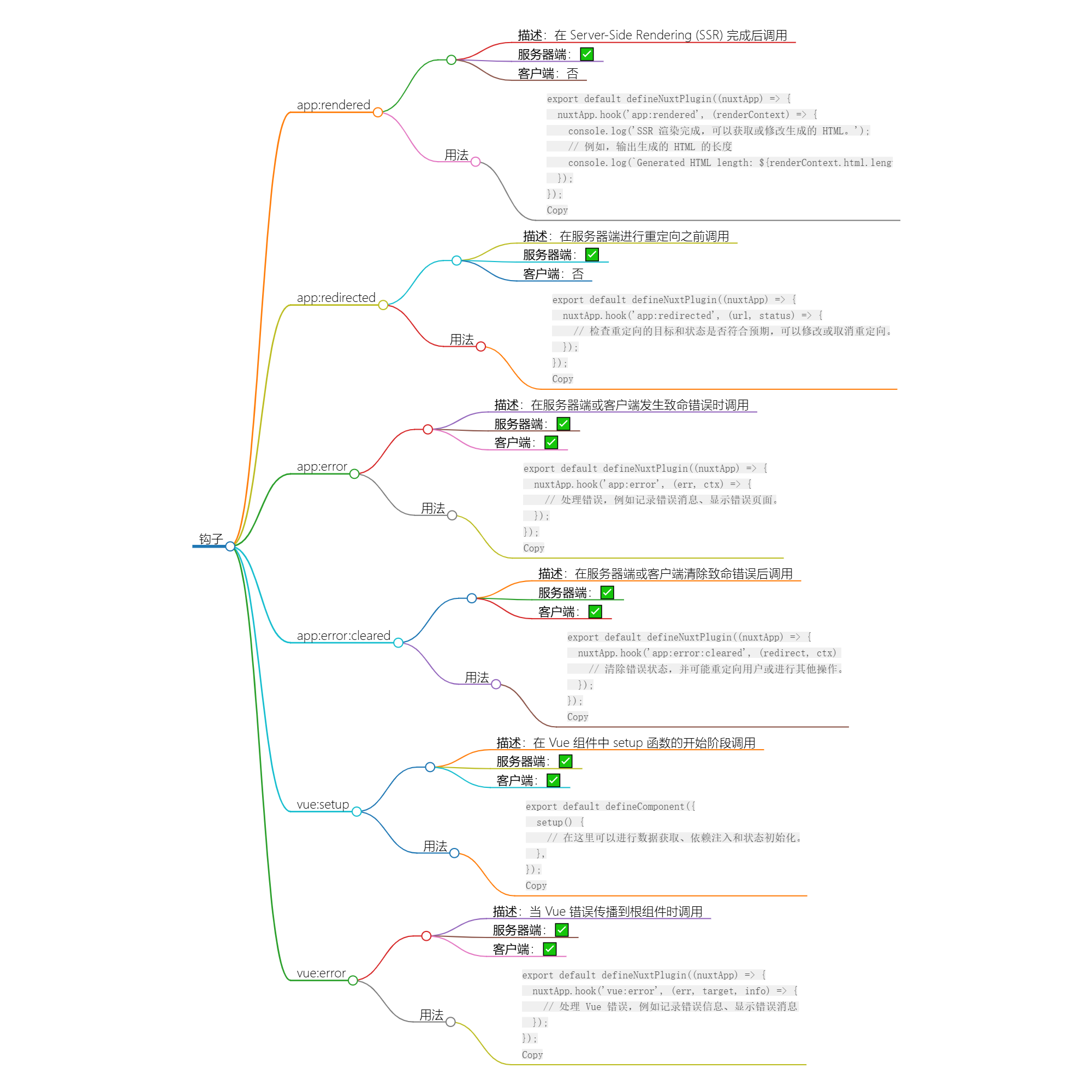 app:error 是 Nuxt 3 的一个全局生命周期钩子,它在服务器端和客户端发生未捕获的致命错误时被调用。这个钩子允许你定义一个自定义的错误处理函数,以便在发生错误时执行特定的逻辑,比如记录错误信息、发送错误报告、显示错误消息或者重定向到错误页面。