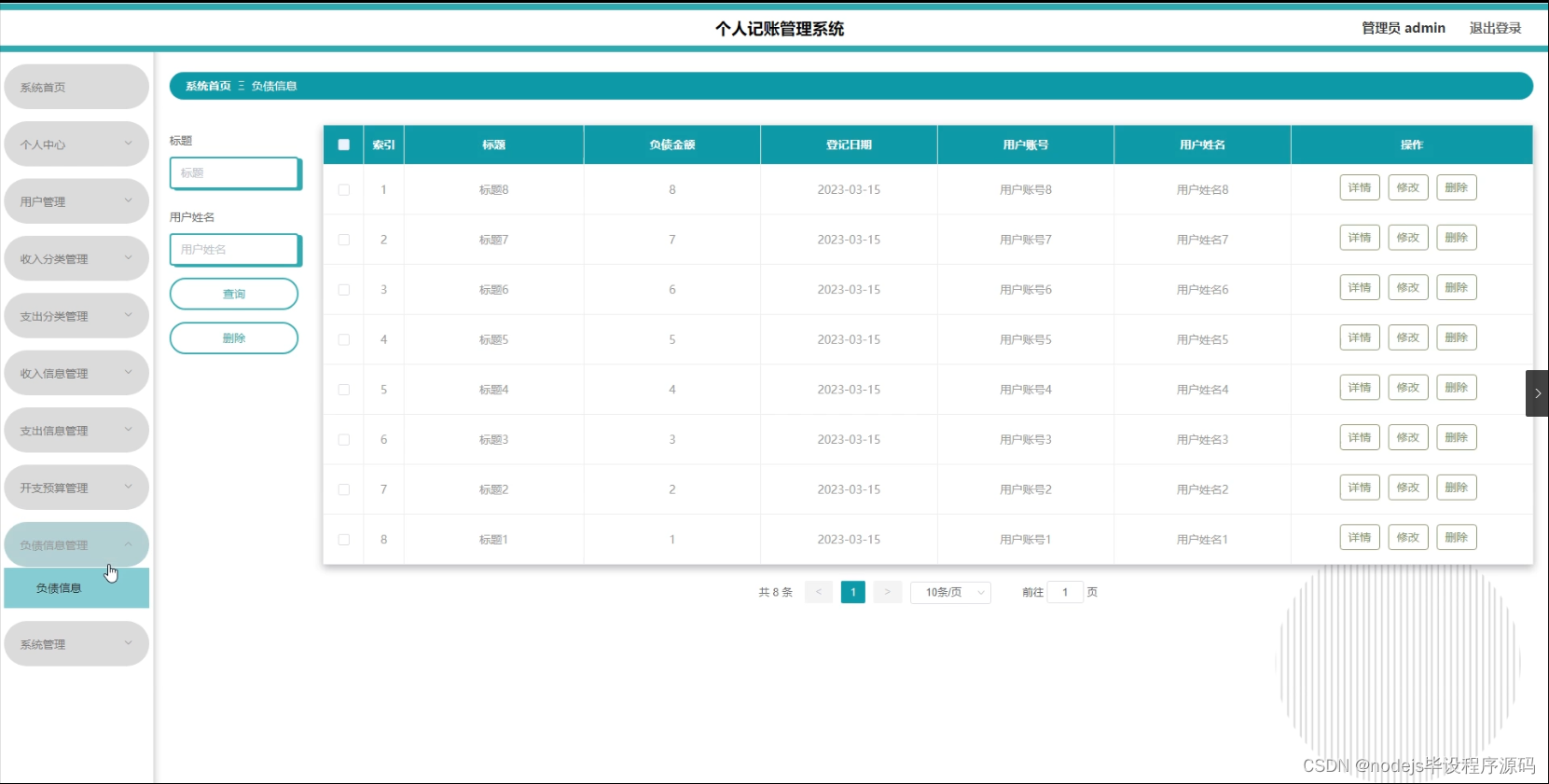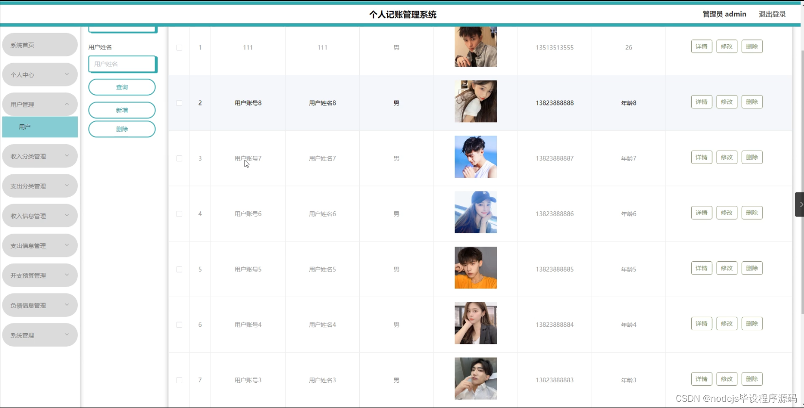 本研究的主要目的是设计并实现一个功能完善、操作简便、安全可靠的RTY个人记账管理系统。该系统将涵盖用户管理、收入分类、支出分类、收入信息、支出信息、开支预算、负债信息等多个功能模块,以满足用户多样化的记账需求。同时,本研究还将探索如何通过优化算法和界面设计,提升系统的用户体验和满意度。最终,本研究的成果将为个人财务管理领域的发展提供新的思路和方法。