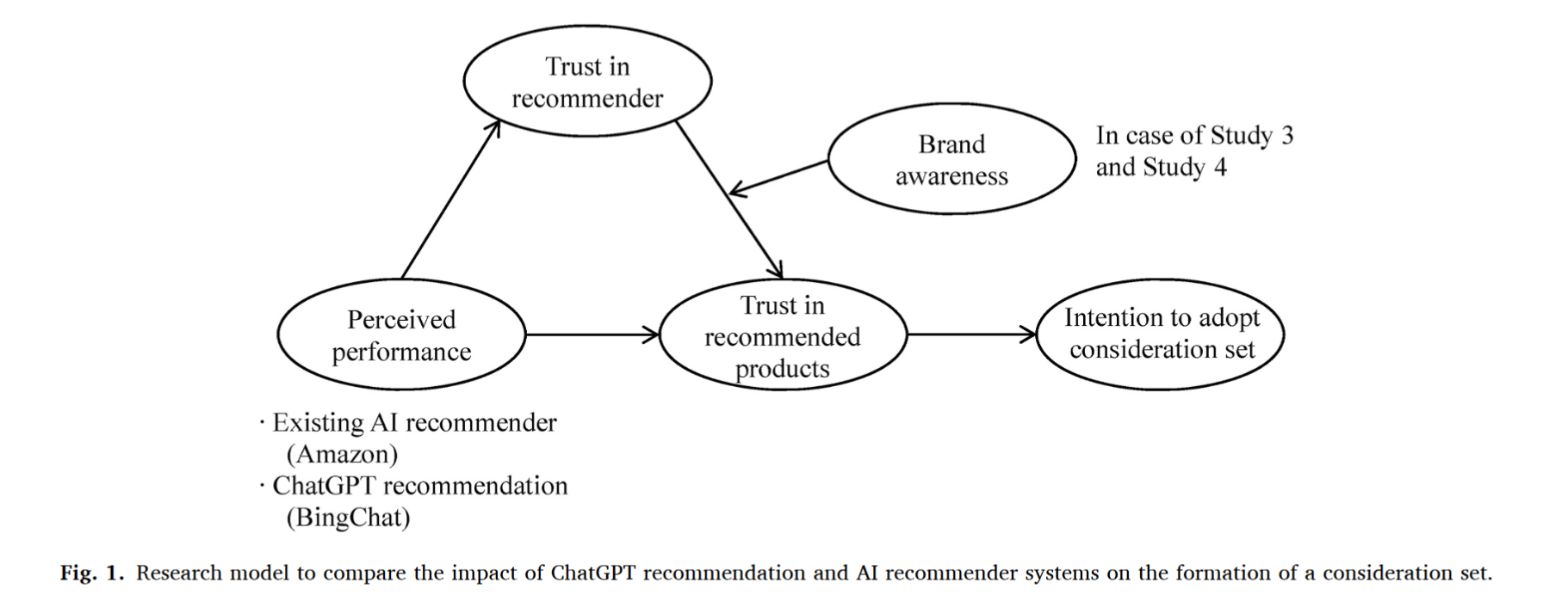 研究发现ChatGPT和现有AI推荐系统通过TR和TP影响消费者从感知绩效到采纳考虑集的意图。ChatGPT在PP对TR的影响以及IC的平均水平上高于现有AI推荐系统。品牌意识的高低显著影响了TP,但在高水平品牌意识的情况下,调节效应不显著。