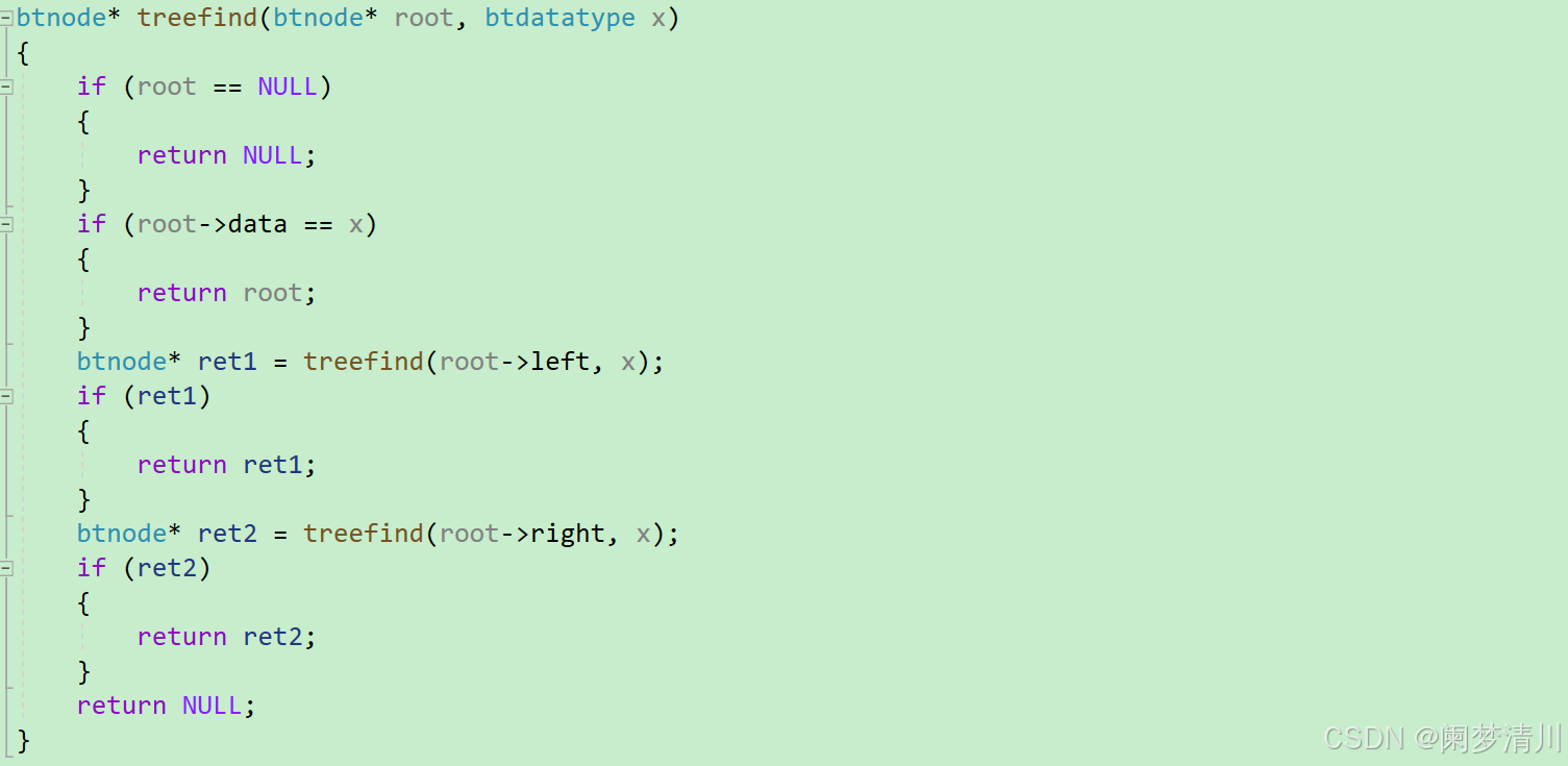 这个里面就是查找某一个特定的节点,这个节点作为返回值,我们定义两个临时变量作为左子树和右子树的返回值,如果左子树找到这个节点,我们就可以直接返回,否则的话,我们就需要去右子树去查找,找到这个节点后作为返回值,如果左子树,右子树找不到的话就返回NULL;