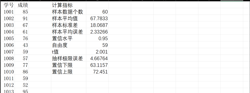 (7)结合样本置信水平为0.95和样本自由度为59,使用TINV函数进行计算,即可得到所求样本数据的t值为2.001;