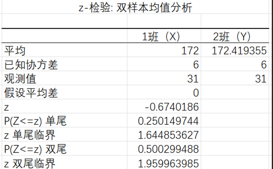 在本题提供的数据中,两个班级的身高平均数非常接近,而且样本量也比较大,因此可以使用z-检验来进行假设检验。在这个例子问题中,假设平均差为0,得到的z值为-0.674,表示样本的平均值距离假设平均值差了0.674个标准差。同时,p值为0.5003,表示双尾检验下拒绝原假设的显著性水平为0.5 > 0.05,故无法拒绝原假设。根据这个结果可以认为,在α=0.05的显著性水平下,两个班级学生的身高没有显著差异。
