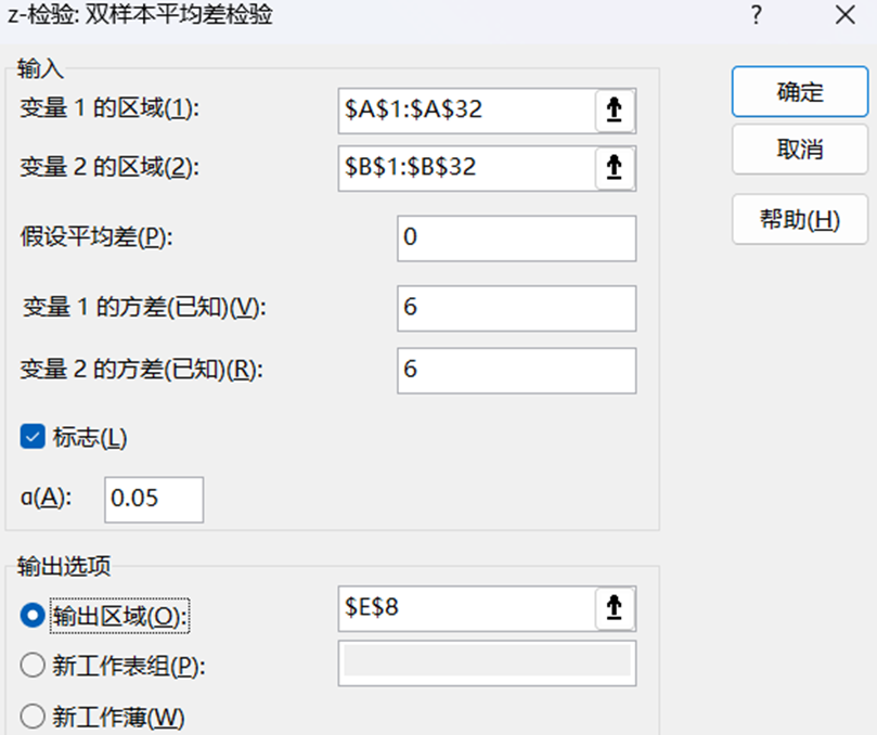 2)结合题中所述的方差为6和置信度为0.05,在z-检验中填入相关信息,即可进行z-分析求解。