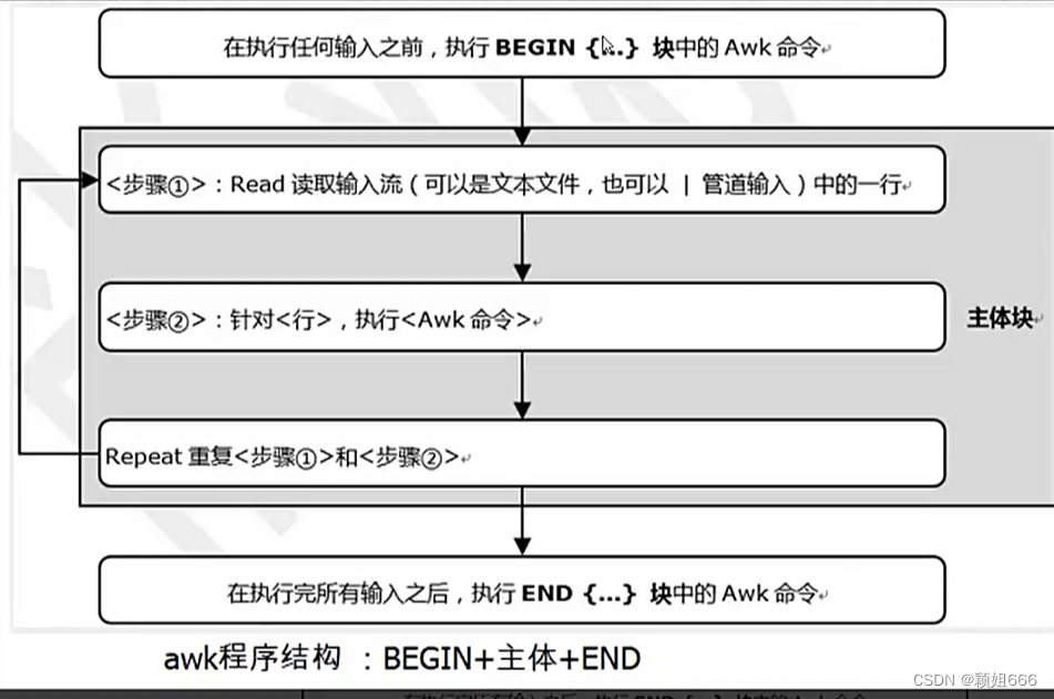 AWK执行的流程非常简单:读(read)、执行(Execute)与重复(Repeat) AWK的工作流程图。