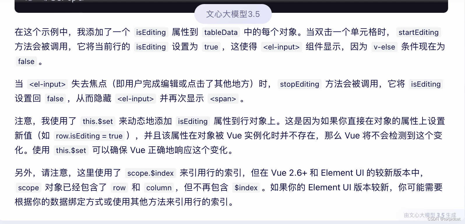 - // 启用编辑模式:设置当前行的isEditing属性值为true,使用 this.$set 同步更新视图为文本框