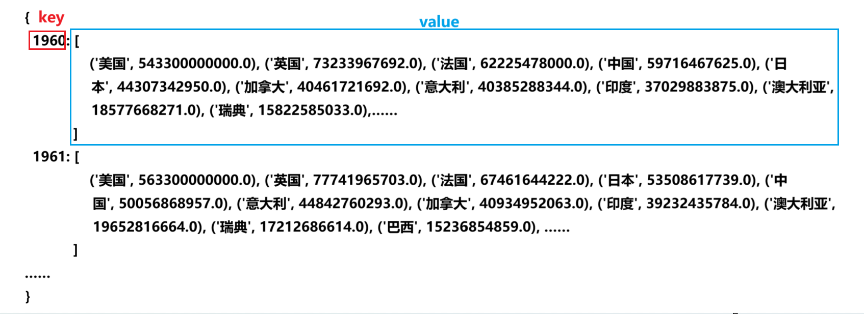 - data_dict[year].append((country,gdp)) #在对应的年份后追加元素[国家,gdp]