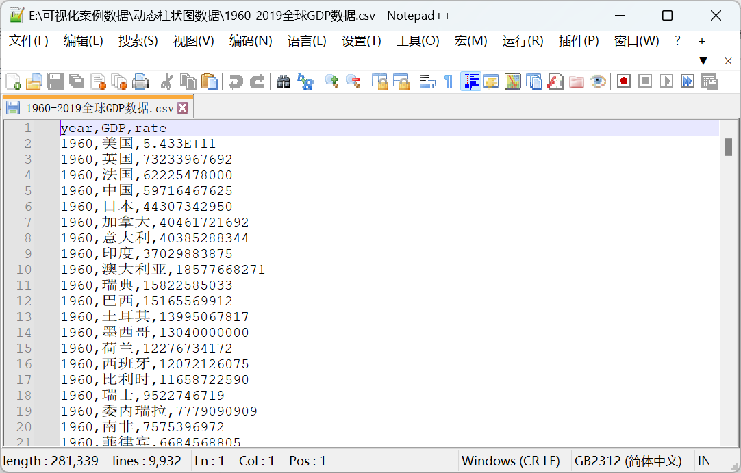 我们要处理一下文件“ 1960-2019全球GDP数据.csv ”中的数据,数据是csv格式,在使用open函数读取文件时要注意,编码格式不再是最常见的“ UTF-8 ”,而是“ GB2312 ”,我们可以在Notepad++界面的右下角看到(“ 1960-2019全球GDP数据.csv ”用记事本打开其编码格式不清晰,建议使用Notepad++):