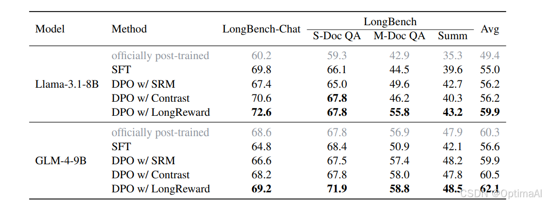 结合DPO算法:将LongReward与离线RL算法DPO结合,构建长上下文偏好数据集,并使用DPO算法对SFT模型进行微调,以增强其长上下文能力。