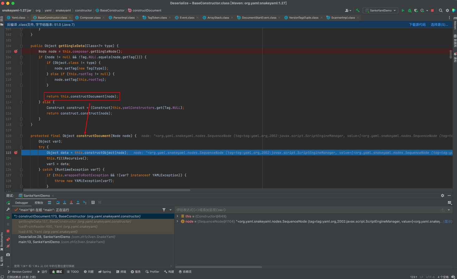 继续跟进,会执行 return this.constructDocument(node)从而进入BaseConstructor#constructDocument方法,其中调用了constructObject方法