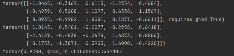 1 2 3 4 5 6 7 | # L1Lossloss = nn.L1Loss()input = torch.randn(3, 5, requires_grad=True)target = torch.randn(3, 5)output = loss(input, target)output.backward()print(input, target, output, sep='\n') |