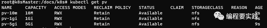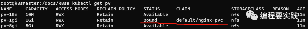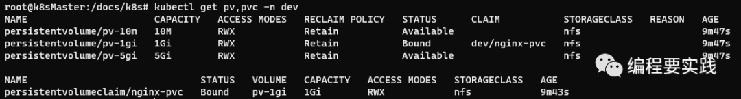 由于申请的是200M空间,可以看到k8s自定绑定到合适的pv对象上,即选择大小为1G的pv对象。