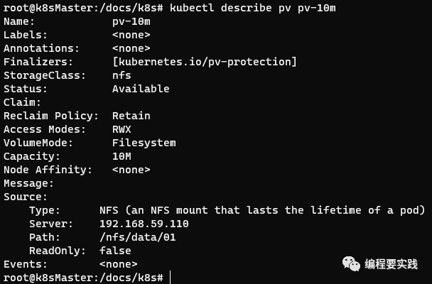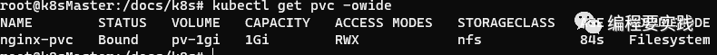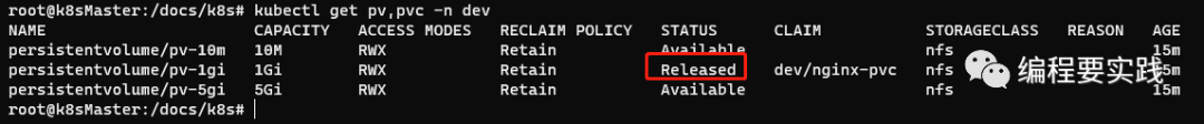 再回过头来查看pv对象的绑定信息,可以看到已经和刚刚创建的pvc对象绑定了。