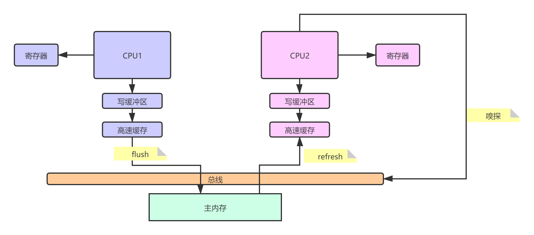 为了实现MESI协议,需要解释两个专业术语:flush处理器缓存、refresh处理器缓存。