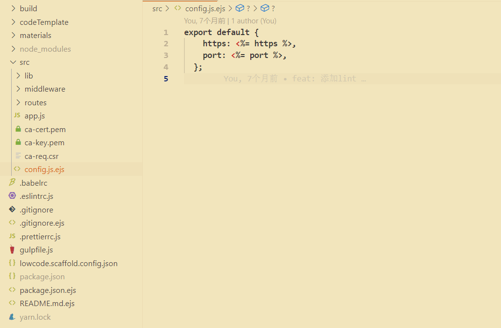 在模板项目根目录下创建 lowcode.scaffold.config.json 文件,将需要做内容动态替换的文件加上 .ejs 后缀。