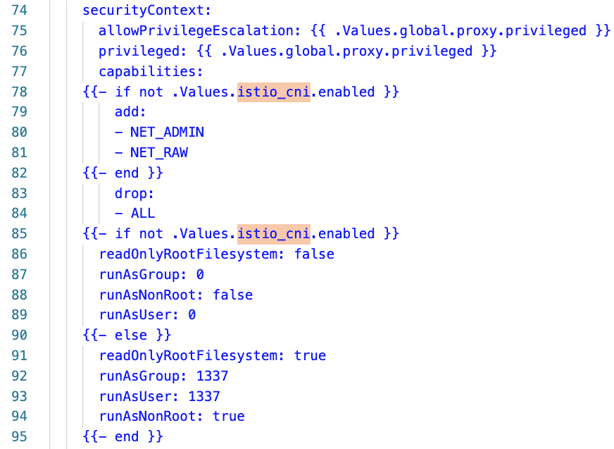 上图是 Istio 自注入模板的代码片断,从中可以看出,当启用 Istio CNI 时,如果启用了 Istio CNI 功能,Istio 向 Pod 注入的容器不再需要高权限。
