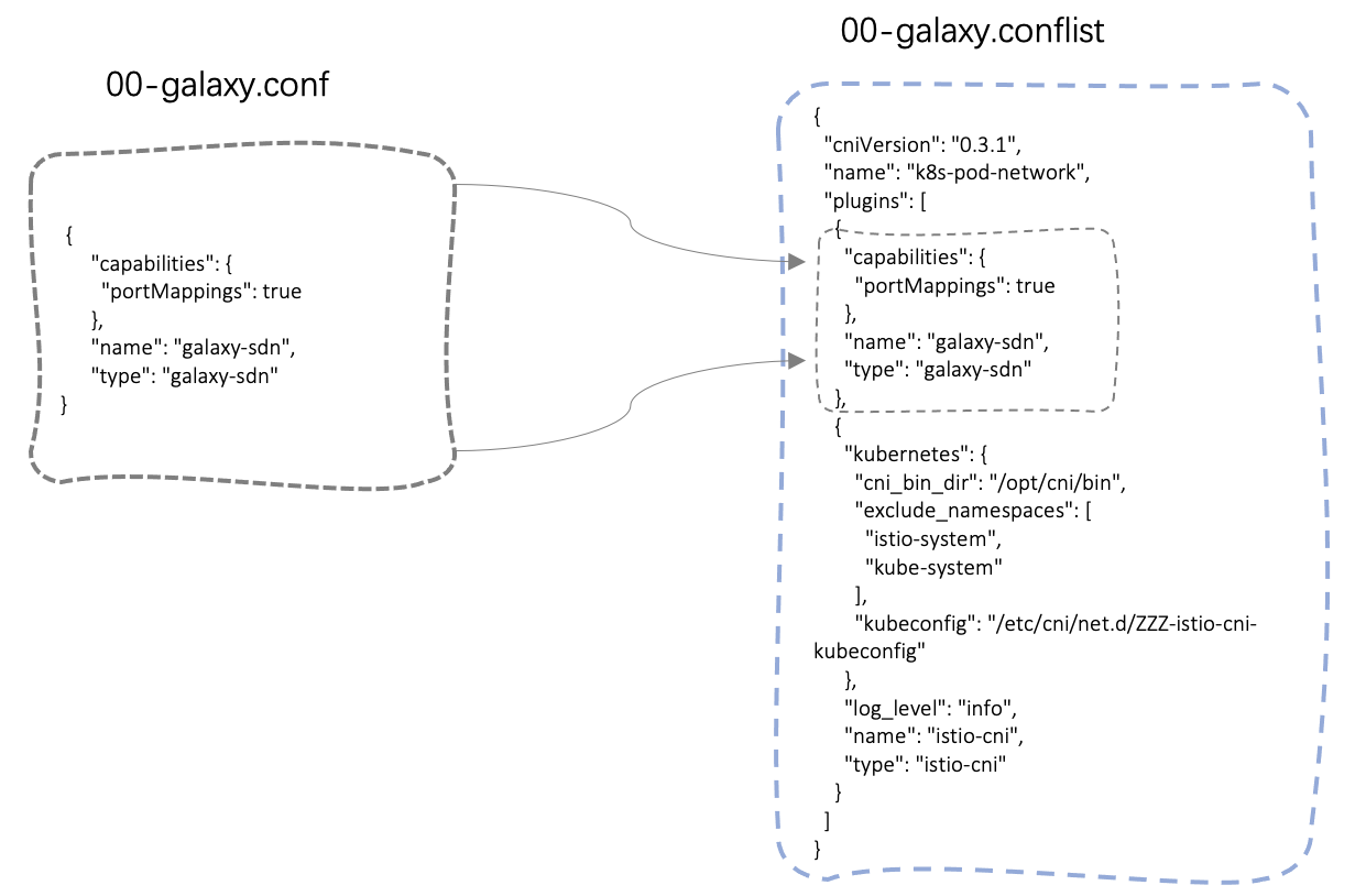 经过测试发现,在一些集群上,Istio CNI 插件默认的插件链运行模式与 Galaxy 不能兼容。原因是,Istio CNI 的配置转换处理过程存在瑕疵:这些集群上的原有 Galaxy CNI 的配置是网卡插件(即 00-galaxy.conf)模式, 经过 Istio CNI 的处理之后,相关配置无法被 Galaxy CNI 识别和处理。