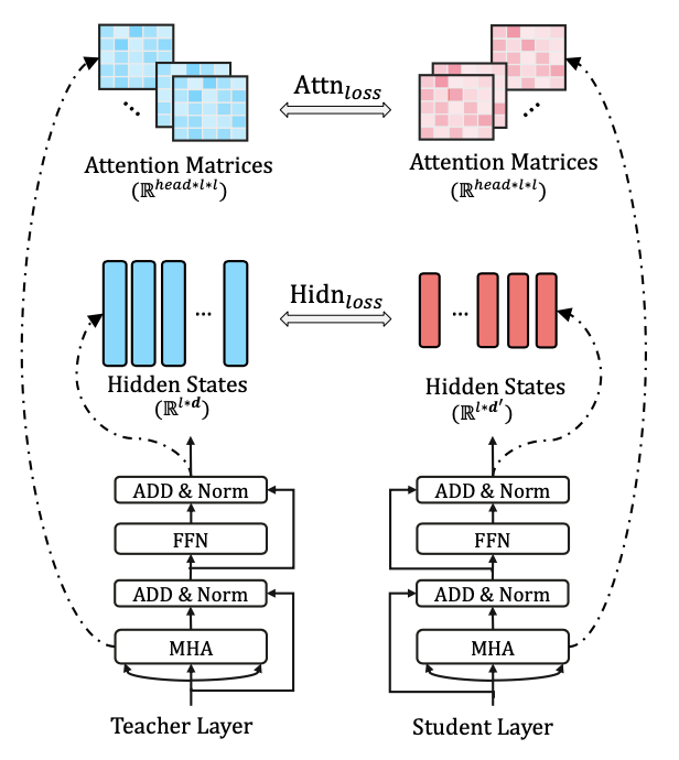 这里和Distill的差异在于,Tiny允许隐藏层大小的差异,所以加入了一个线性映射Wh来对齐student和teacher隐藏层的维度。