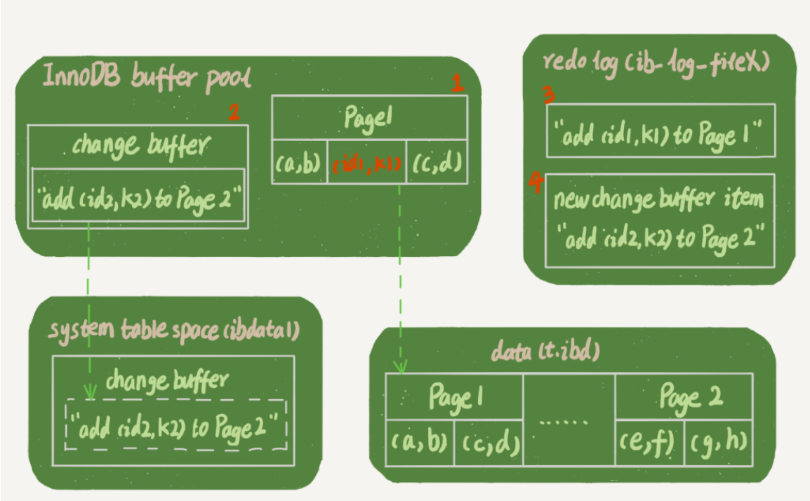 Page 2 没有在内存中,就在内存的 change buffer 区域,记录下“我要往 Page 2 插入一行”这个信息