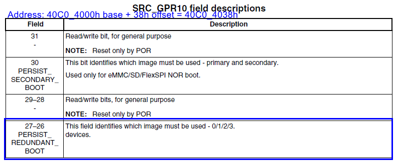 现在 Flash 里有了两份 image,当第一份 image 启动失败后,i.MXRT1170 BootROM 不是立刻去执行下一份 image ,还是那个取巧的方法,在一个软复位不置位的寄存器里(SRC_GPR10)标记当前状态,然后调用 NVIC_SystemReset() 重新进入 BootROM 执行。不过此时标记位从 GPR10[30] 换到了 GPR10[27:26],虽然是 2bit 状态,但设值 1/2/3 等效于设值 1,因为对于串行 NOR Flash 最多就是两份 image。这时候如果你想挂 J-Link 改写 SRC_GPR10 去做快速验证恐怕无法如愿,因为 《i.MXRT1170上用J-Link连接复位后PC总是停在0x223104》。