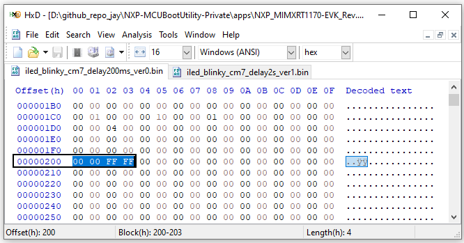 当然如果你嫌上述方法繁琐,也可以直接在最终 image binary 文件上做修改(注意 offset 位置一定要找对,i.MXRT1170 SDK XIP binary 文件起始数据对应 Flash 偏移是 0x400,因此文件中 0x200 处才对应 Flash 偏移 0x600):