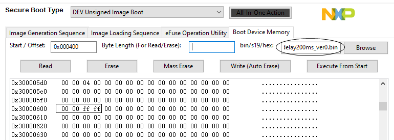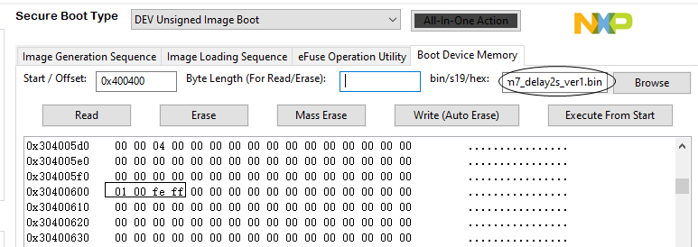 继续用 \SDK_2.11.0_MIMXRT1170-EVK\boards\evkmimxrt1170\demo_apps\led_blinky\cm7\iar\flexspi_nor_debug 例程生成两个稍微不一样的 image,闪灯间隔时间一个是 200ms(image L - iled_blinky_cm7_delay200ms.bin),另一个是 2s(image H - iled_blinky_cm7_delay2s.bin)。在 MCUBootUtility 工具主界面下使用 All-In-One 操作将 image L 下载进 Flash(base address 设为 0x30000400),使用通用编程器界面 Write 操作将 image H 也下载进 Flash(Start 设为 0x400400)。
