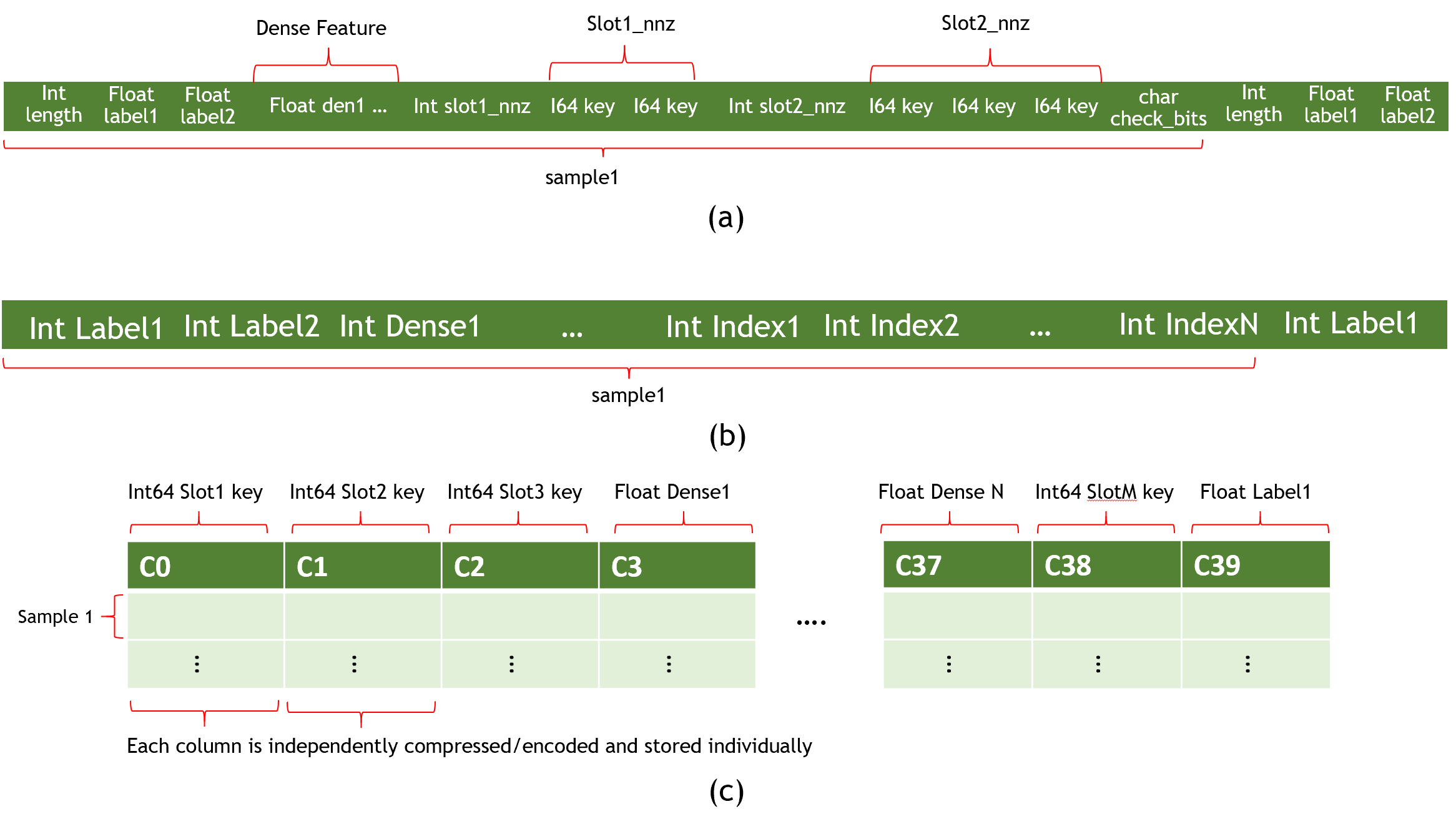 数据字段(field)通常有很多样本。每个样本以格式化为整数的标签开始,然后是nnz(非零数)和使用 long long(或无符号整数)格式的输入key,如图 1(a)所示。