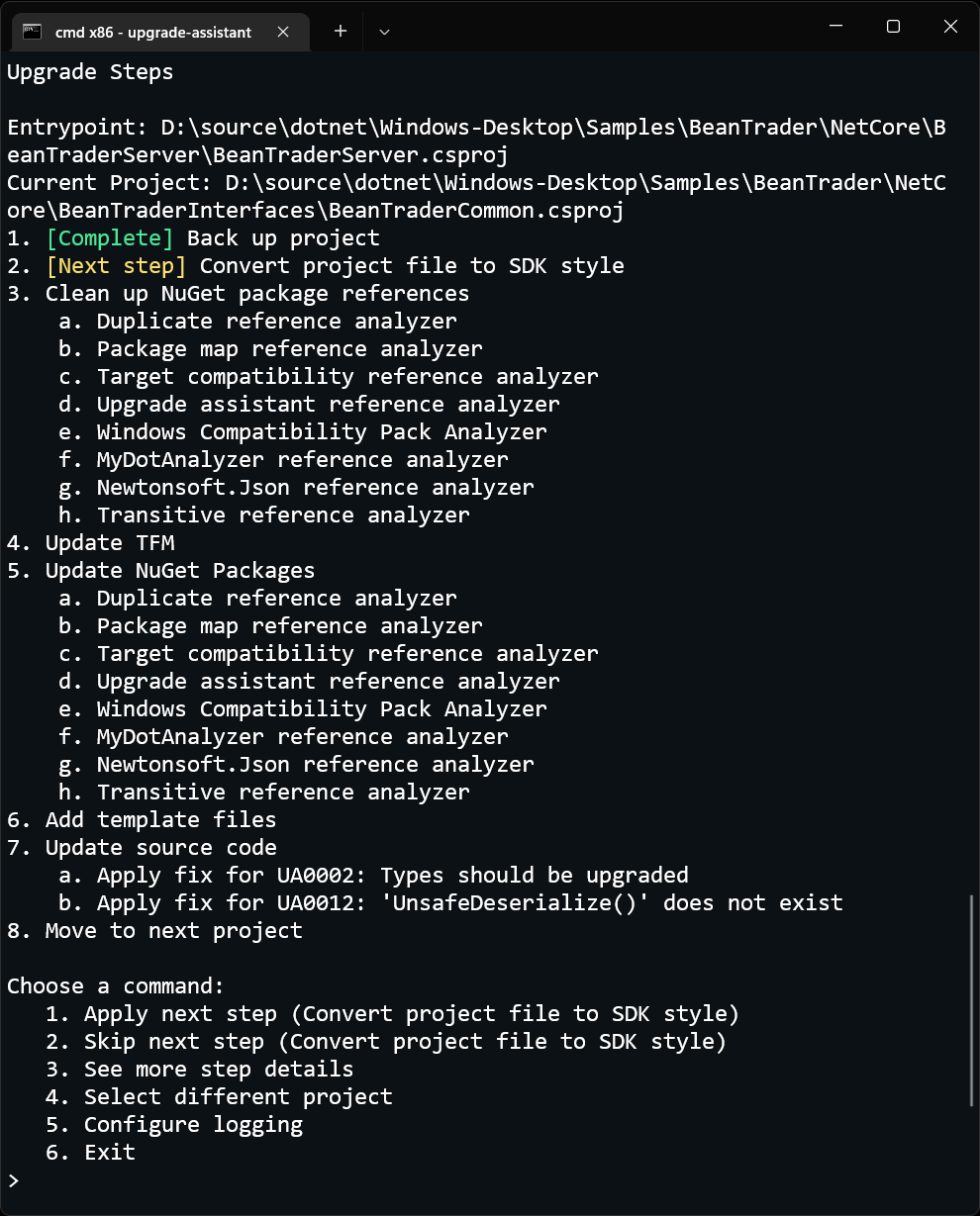 升级助理安装之后,我可以在 BeanTrader 解决方案上运行它来开始迁移过程。通过在解决方案 ( 而不是特定项目上 ) 运行,我可以通过执行一次该工具,来升级类库和服务器控制台应用两者。