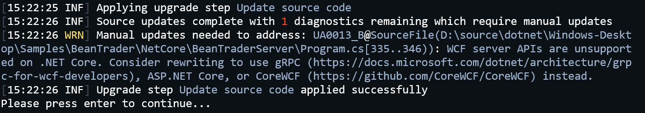 在检查 C# 源是否有任何必要的更改时,升级助手会发出有关 WCF 使用情况的警告。警告消息提醒我,BeanTraderServer 使用服务器端 WCF API,这些 API 在 .NET 6 上不受支持,并且该工具未进行升级。它告诉我,我需要手动进行更改,并建议升级到 CoreWCF、gRPC 或 ASP.NET Core。