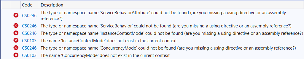 现在升级助理已经完成了升级过程,是时候升级 CoreWCF 了。在 Visual Studio 中打开 Bean Trader 解决方案,我发现 BeanTraderCommon 类库可以成功构建。项目升级到 .NET Standard 已经完成了。而 BeanTraderServer 项目有一些错误,可以想到,关联到不能找到某些 WCF 类型。