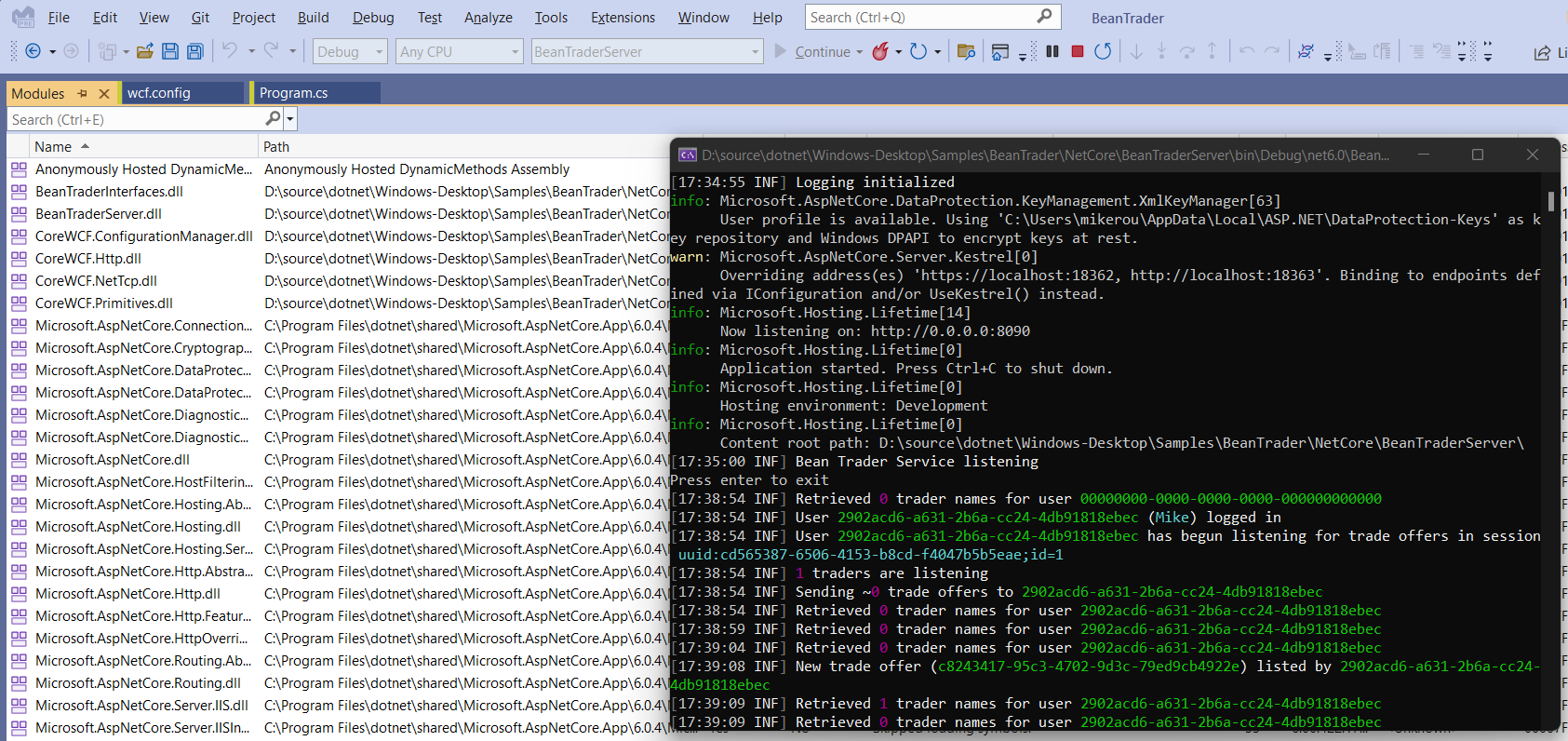 通过这些修改,该 Bean Trader 服务现在完全迁移到了 .NET 6! 我可以运行该服务应用,并使用现在的客户端连接到它。并且 WSDL 也可以通过 localhost:8080/metadata 来下载。想要看到完整的本文中所有的修改,你可以 查看该 PR,它这样修改了 Bean Trader 示例应用。最后,示例项目的 NetCore 文件夹中包含了只有 .NET Core 和面向 .NET 6 的项目!