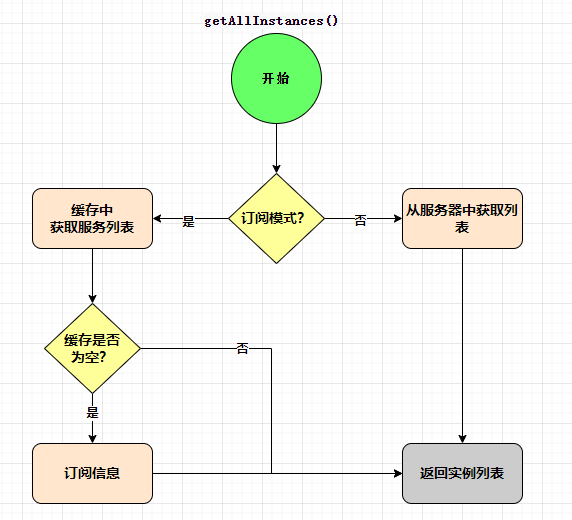 如果是订阅模式,直接从本都缓存中获取服务信息,然后从中获取实例列表,订阅机制会自动同步服务器实例信息到本地,如果缓存中没有,说明是首次调用,进行订阅后获取服务信息,具体流程如下: