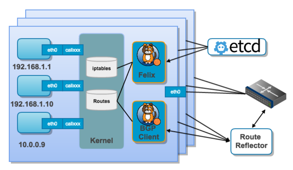 - BIRD-Route Reflector(可扩展的组件),BGP客户端在每个节点上运行,其随着节点数量越来越多,一个BGP客户端需要连接更多数量的其他BGP客户端,其网络连接的数量非常多且网络会变得复杂。在节点之外,允许将BIRD程序配置成"Route Reflector"路由反射器工作方式,BGP客户端可以直接连接到"Route Reflector"路由反射器,而不是很多数量的其他BGP客户端,从而减少网络连接的数量,以提高BGP网络的性能。