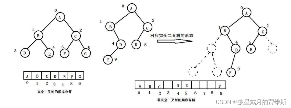 顺序结构存储就是使用数组来存储,一般使用数组只适合表示完全二叉树,因为不是完全二叉树会有空 间的浪费。而现实中使用中只有堆才会使用数组来存储,关于堆我们后面的章节会专门讲解。二叉树顺 序存储在物理上是一个数组,在逻辑上是一颗二叉树。