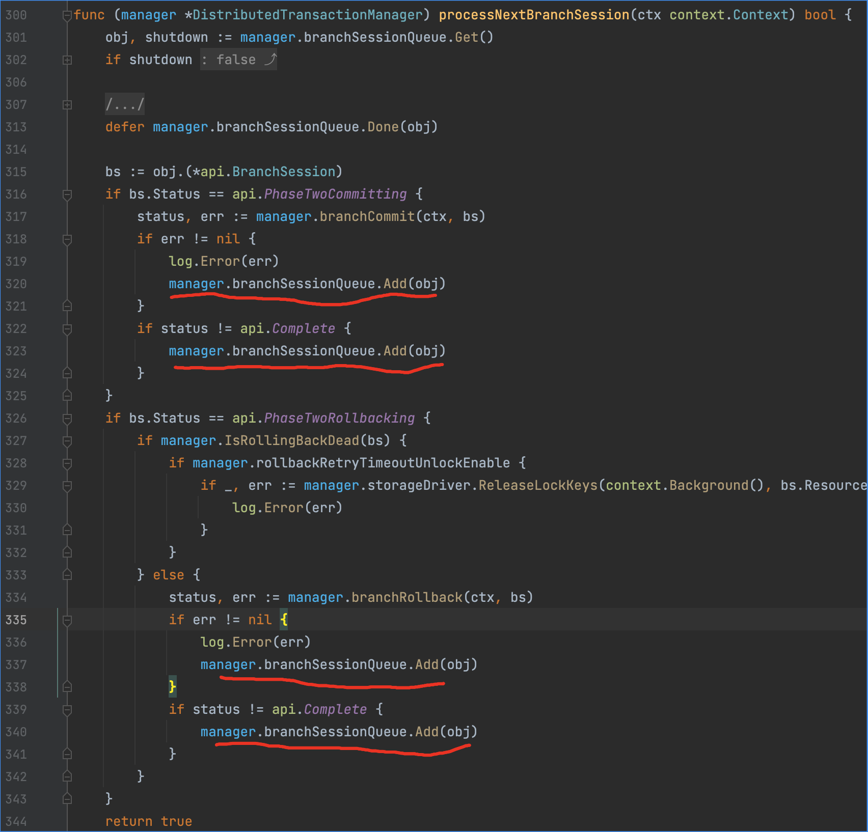 事务分支提交或者回滚失败后,会重新进入到 workqueue 当中继续消费,直至提交、回滚成功,或回滚超时(AT 模式回滚操作涉及到全局锁的释放,需要设置超时时间,即 retry_dead_threshold)。
