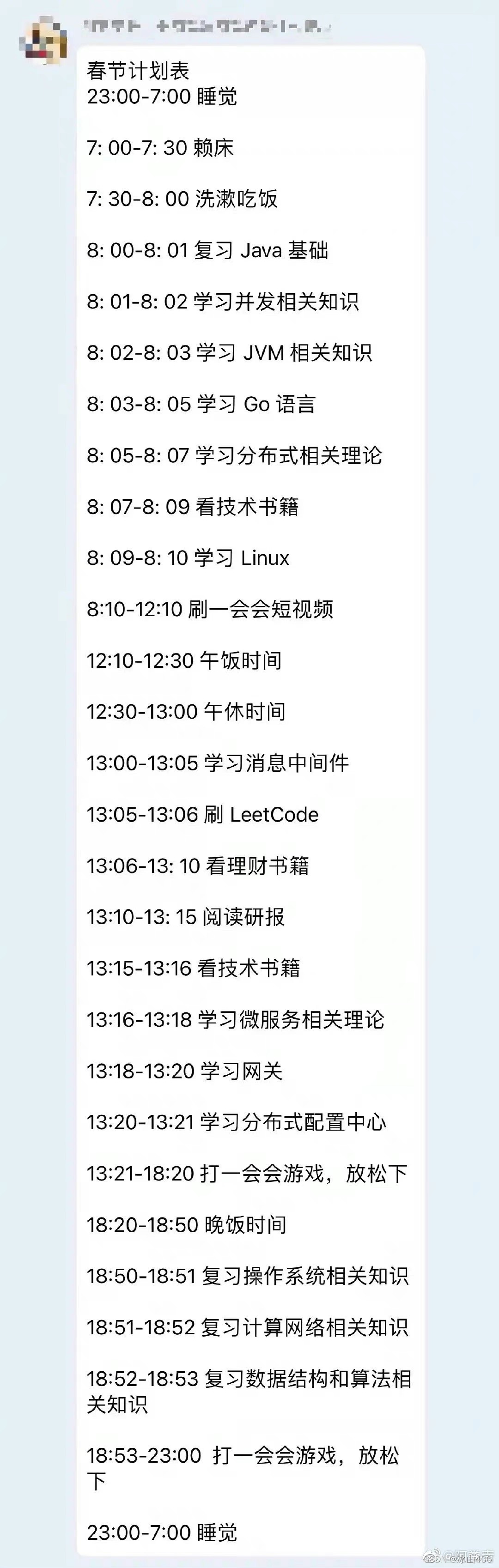 近日,一份疑似程序员网友的春节计划表被公开,计划甚至精准到了每一分钟!网友们直呼:太认真了!