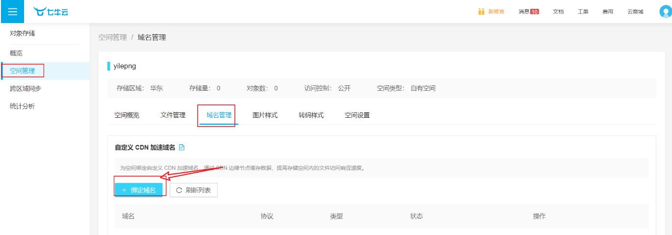 2、存储空间绑定自定义域名(cdn加速):绑定一个http协议的域名