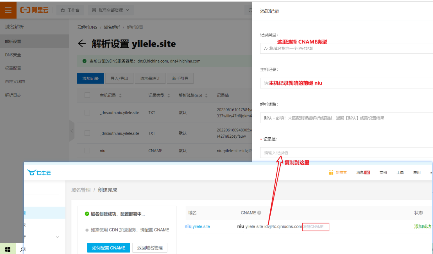 - 我阿里云的一级域名是 yilele.site,那么我在七牛云配置一个自定义域名选择二级域名(加前缀,这个前缀不能是www,这个前缀在我阿里云dns解析已经拥有了),随便起一个前缀,例如我的前缀是niu,则在七牛云使用的自定义域名为 niu.yilele.site