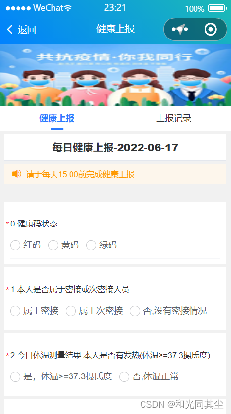 健康上报:能够满足学生每日防疫信息的填报工作。