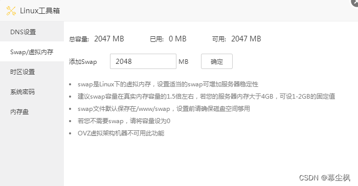 【 软件商店 】安装Linux 工具箱,然后在 Linux 工具箱窗口点击左侧的【 Swap/虚拟内存 】,填写 Swap 虚拟内存 大小,然后点击【确定】。宝塔官方建议 swap 容量在真实内存容量的1.5倍左右,若您的服务器内存大于4GB,可设 1-2GB 的固定值。(1GB=1024MB)