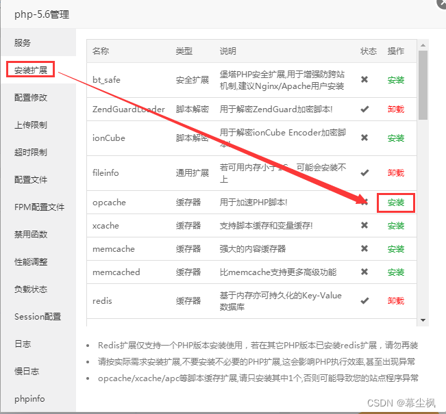 登录宝塔面板,进入已安装PHP版本的管理界面,在管理界面左侧的【 安装扩展 】,选择您需要的缓存插件进行安装。