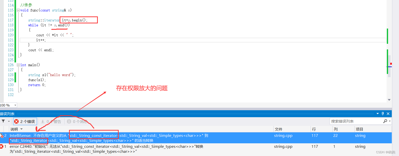 加上const后是跑不过去的,因为 begin 和 end 返回时存在权限放大的问题