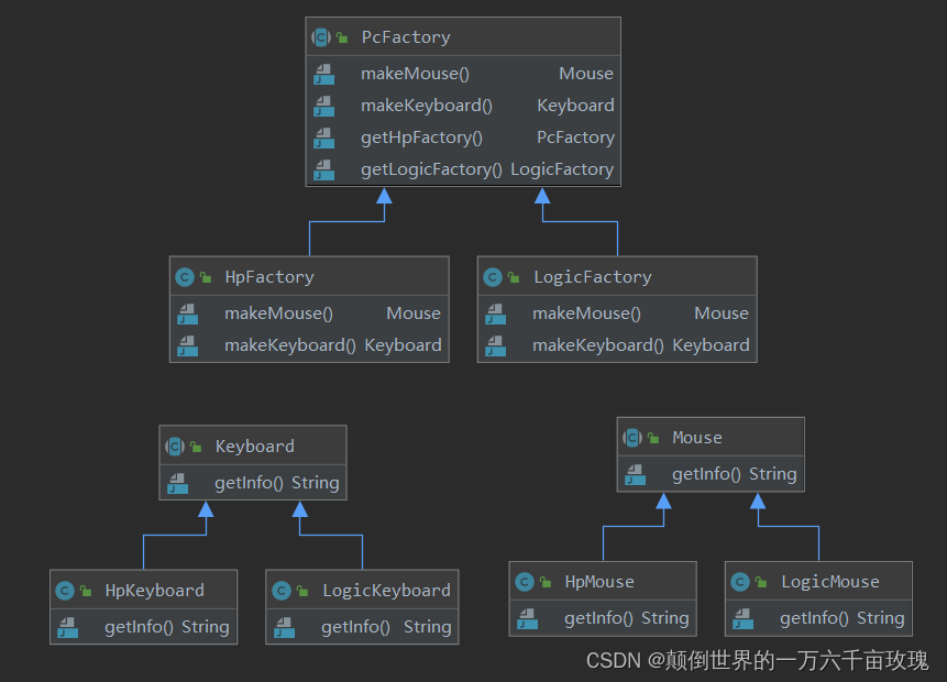 我们都比较熟悉的电脑制造相关行业,有HP,罗技,联想,戴尔,近几年华为,小米也进来了,每个生产商生产的电脑又包括鼠标,键盘,屏幕等等配件。此时我们需要使用工厂模式来进行管理不同的产品族,这时使用简单工厂(也有叫作工厂方法的)已经无法满足要求,此时可以使用抽象工厂。